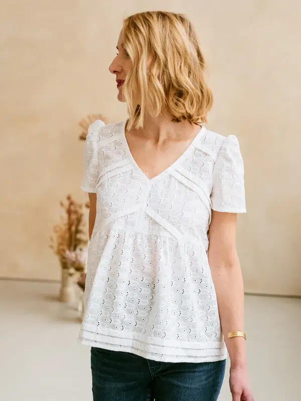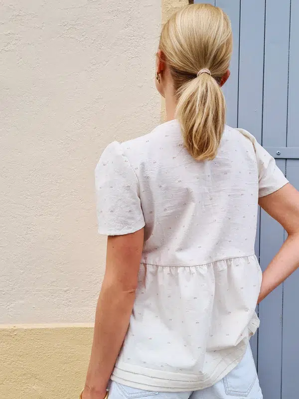Son col en V flatteur, sa forme légèrement ample et ses options de plis sur le corsage et/ou la basque permettent de créer deux styles différents avec un seul patron.