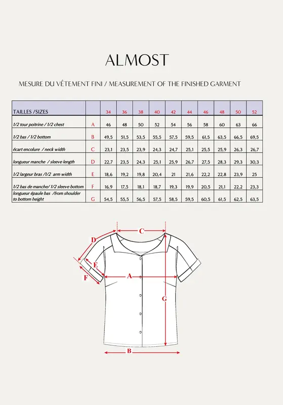 Patron gradé du 34 au 52 avec marges de couture incluses. Un tableau des mesures du vêtement fini est disponible dans les visuels du produit.