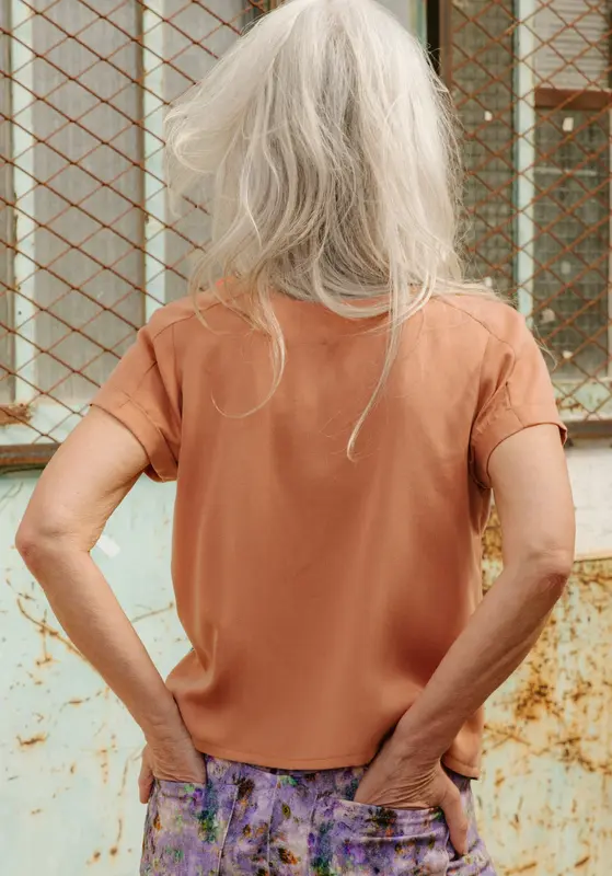 Sa coupe droite et son petit col souple évoquent les chemisettes masculines, tandis que les pinces et les proportions ajustées apportent une silhouette féminine et équilibrée.