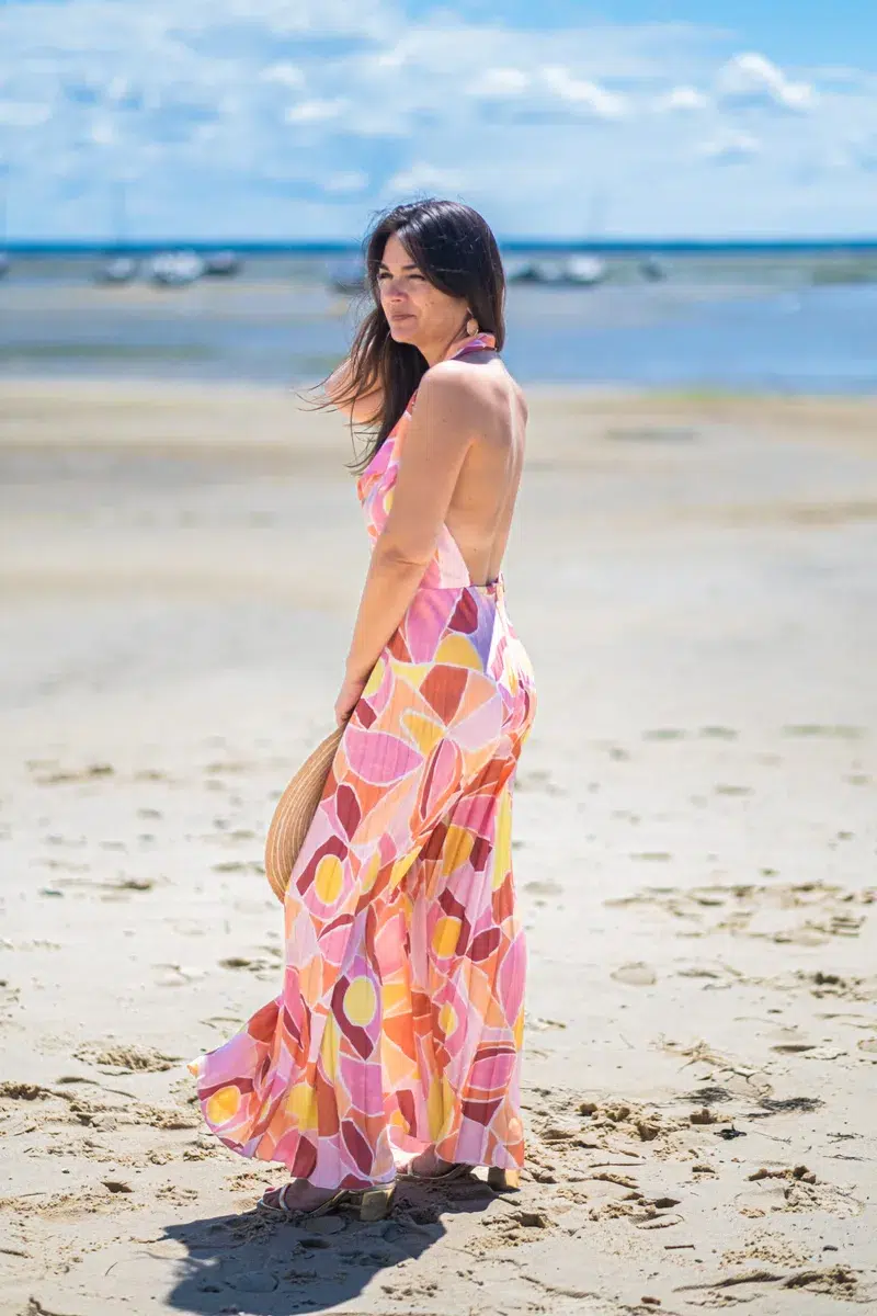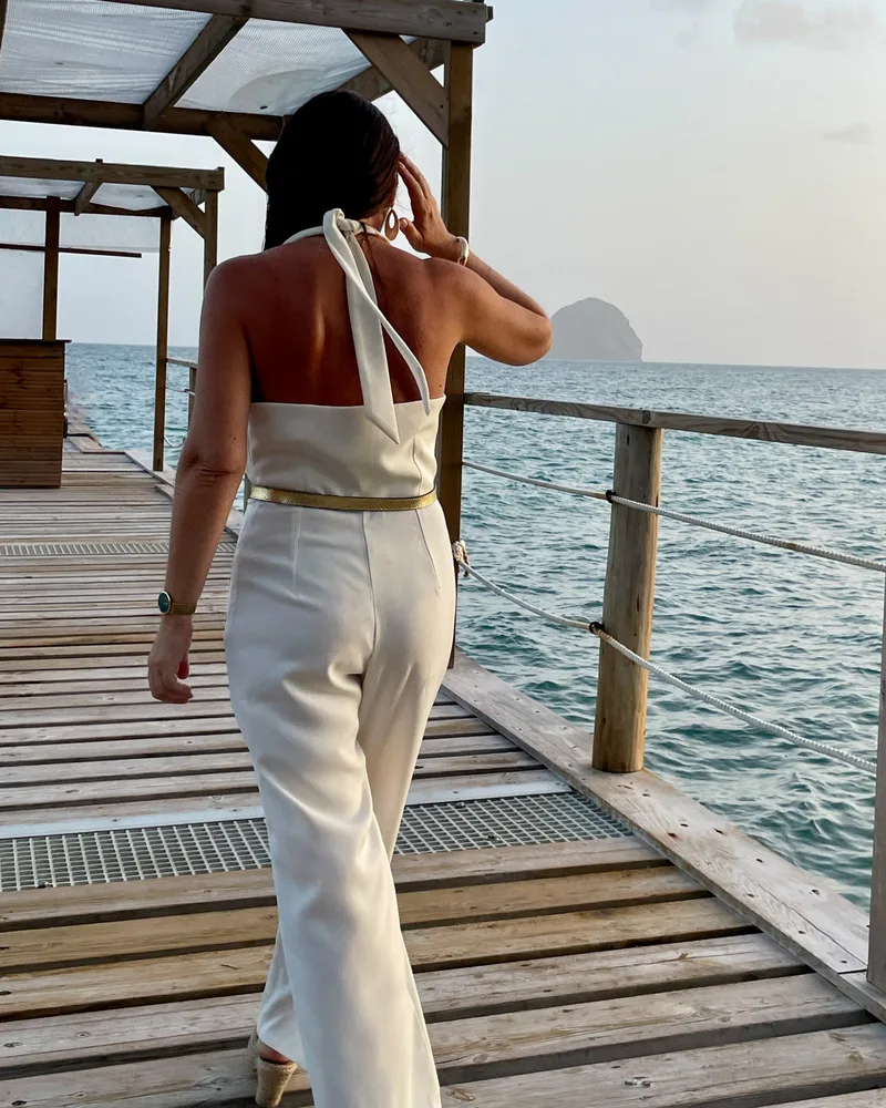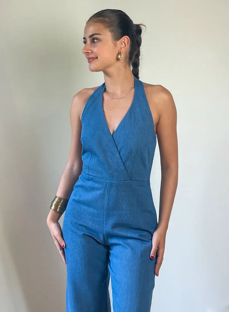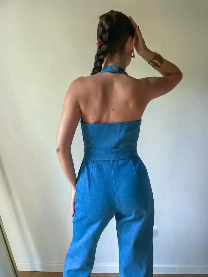 Le buste croisé se noue ou se boutonne dans la nuque, créant un décolleté féminin qui met en valeur les épaules. Deux options sont incluses :
