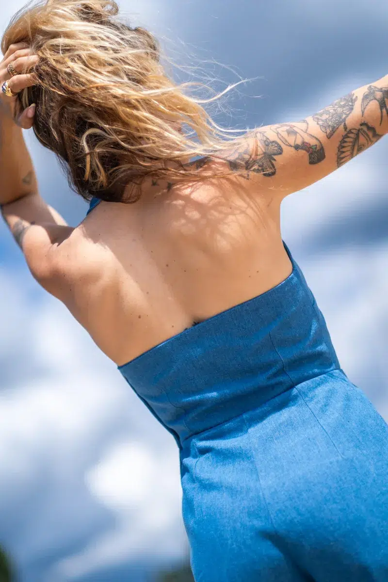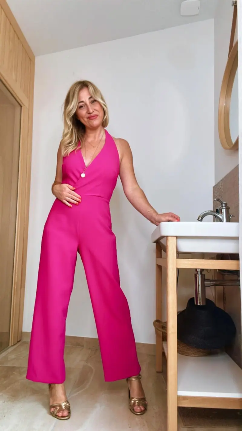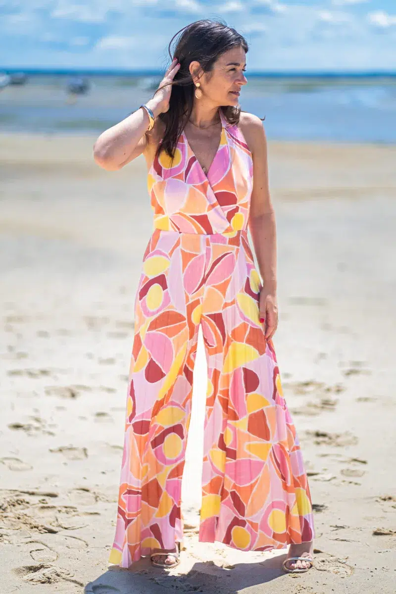 Le buste croisé se noue ou se boutonne dans la nuque, créant un décolleté féminin qui met en valeur les épaules. Deux options sont incluses :
