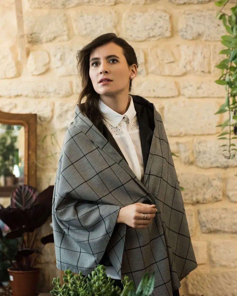• avec un col châle fluide d’un côté, ou un col montant souple de l’autre selon le sens du pliage
