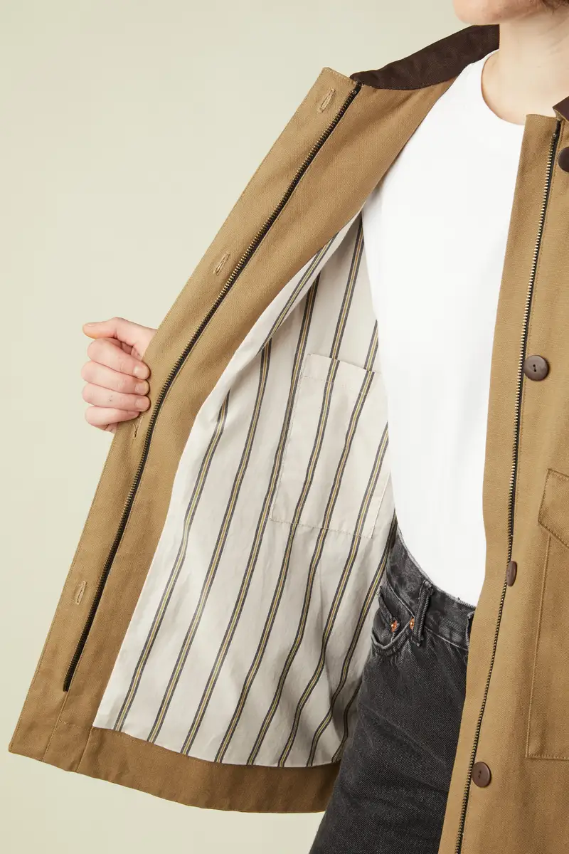 C’est un modèle doublé, à la coupe ample et droite, qui incarne une élégance décontractée avec un esprit à la fois rural et urbain.