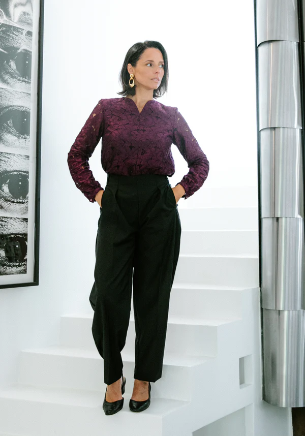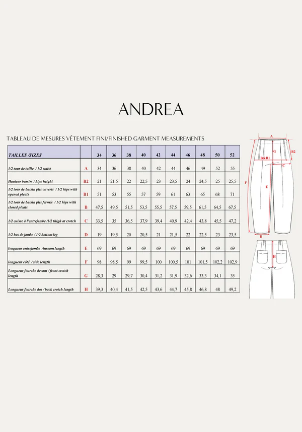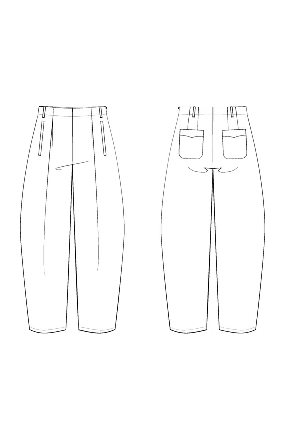 Andrea est un patron de pantalon pour femme à la coupe barrel leg, à la fois structurée, moderne et flatteuse.