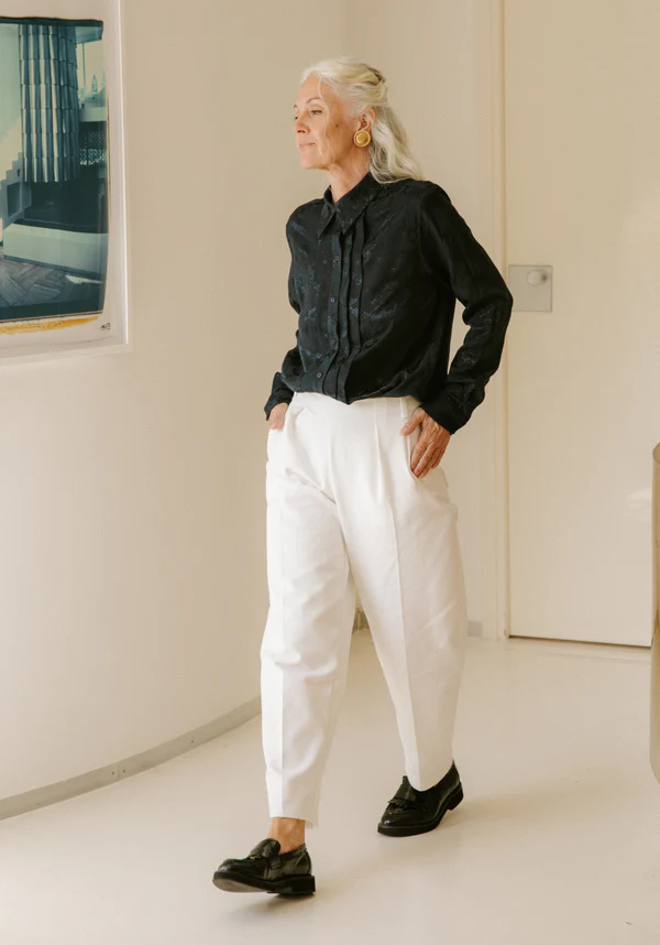 Sa jambe arrondie puis resserrée à la cheville lui confère une silhouette unique, entre tailoring affirmé et décontraction maîtrisée.