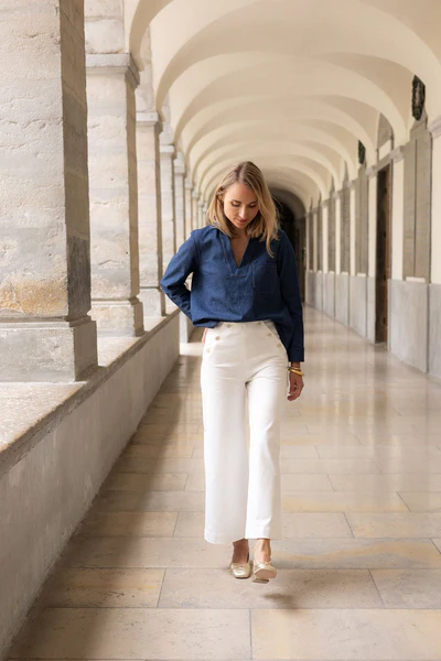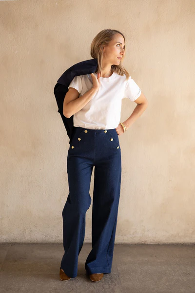 Inspiré du style marin, ce pantalon à pont se décline en version longue ou 7/8ème, avec sa taille haute flatteuse et ses jolis boutons décoratifs.
