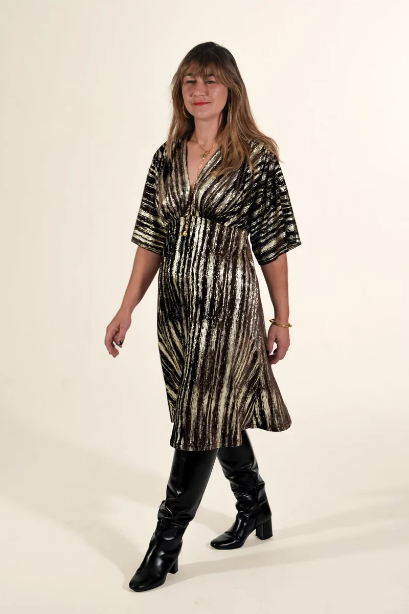 Pensée pour la maille extensible (jersey, velours…), Anabelle peut aussi être cousue dans un tissu non-extensible grâce au tuto illustré gratuit fourni.