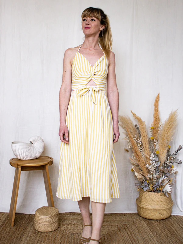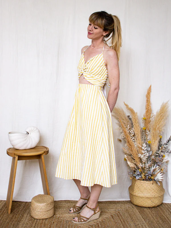Elle se décline aussi en une superbe version deux-pièces : crop top noué (devant ou dos) et jupe midi.