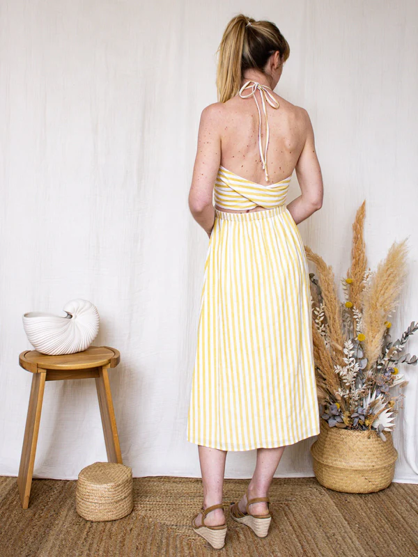 Bali, c’est la robe estivale par excellence : élégante, ajourée à la taille, et dotée d’un dos nu subtilement structuré par de fines bretelles croisées.