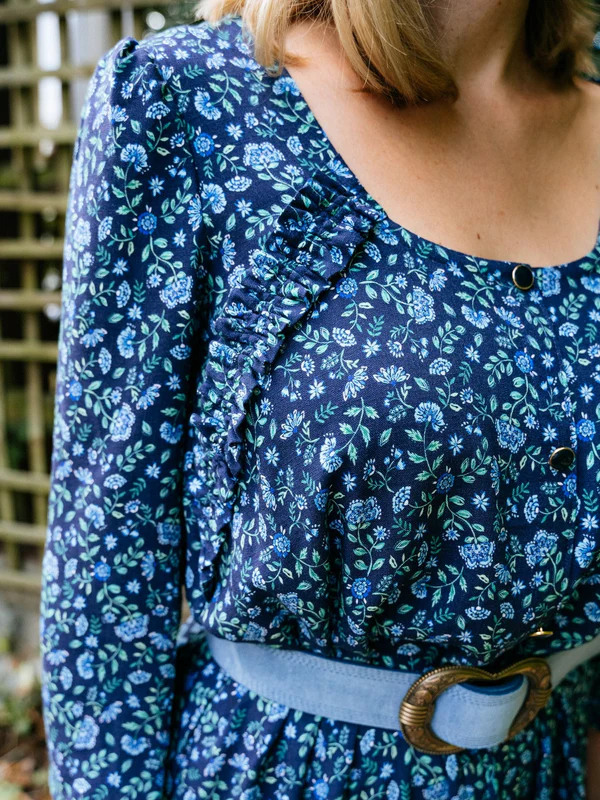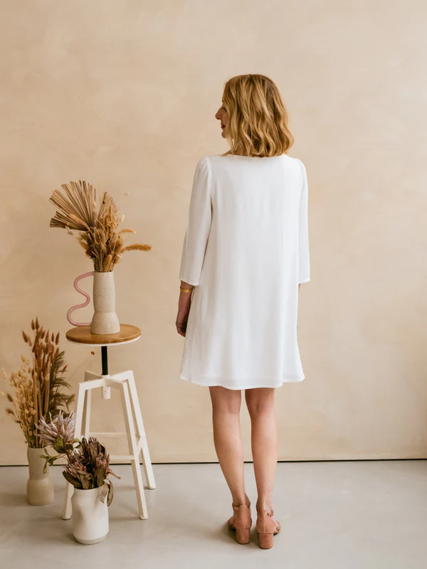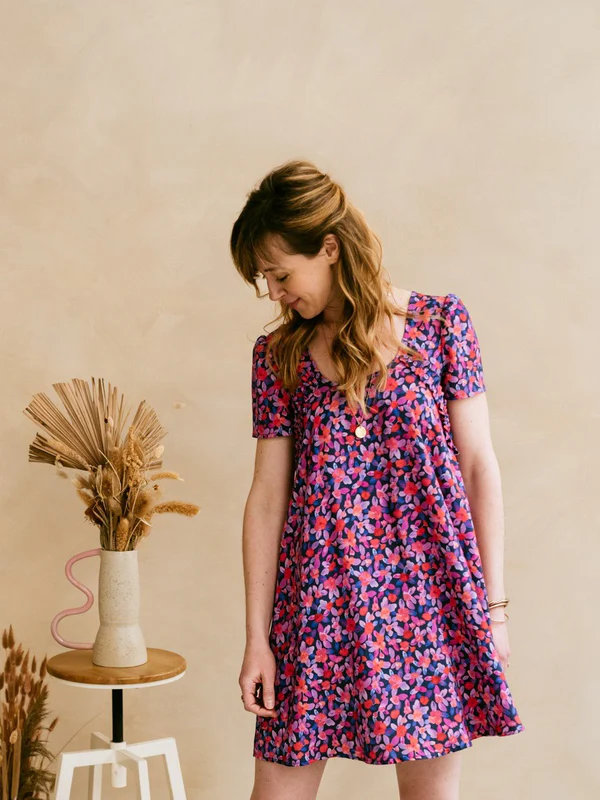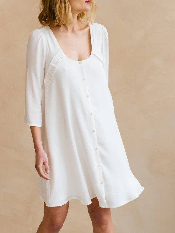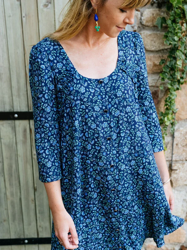 Disponible en version robe ou blouse, elle se distingue par ses jolis empiècements froncés, sa patte de boutonnage devant ou dos, et un choix de manches courtes ou 3/4.