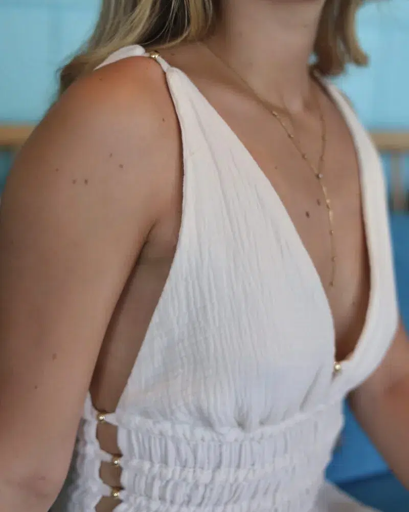 Son décolleté profond devant, souligné par un petit lien fantaisie (à customiser avec des perles décoratives, facultatives), reste discret et bien couvrant.