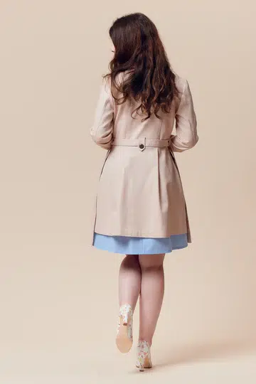 Les manches en deux parties sont agrémentées de pattes de boutonnage, tandis que les poches passepoilées en biais et la ceinture à nouer soulignent le style classique du trench.